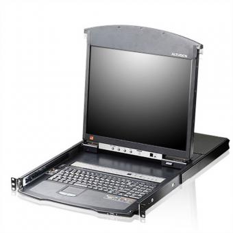 Der KVM-Switch KL1508AiN ist ein LCD-KVM-Switch in Doppelschienen-Ausführung, der es ermöglicht, bis zu 8 Computer von einer einzigen Konsole (Tastatur, Monitor und Maus) aus zu steuern. Er besitzt einen eingebauten LCD-Bildschirm, eine vollwertige Tastatur und Touchpad und ist in einem 1HE-Einschub für 19-Zoll-Schränke in einem ausziehbaren Gehäuse montiert.Der LCD-Monitor und das Tastaturmodul mit Touchpad lassen sich unabhängig voneinander aus dem Schrank herausziehen. Um mehr Platz im Rechenzentrum zu schaffen, kann das Tastaturmodul mit Touchpad eingeschoben werden, während der schlanke LCD-Bildschirm zur Überwachung der Computer ausgeklappt und flach anliegend am Schrank bleibt - so kann die Aktivität der Computer bequem überwacht werden.Der KL1508Ai gibt lokalen und entfernten Sysops die Möglichkeit, über ein IP-Netzwerk mehrere Computer zu überwachen und zu steuern. Weil er das TCP/IP-Protokoll zur Kommunikation verwendet, kann der KL1508Ai von einem beliebigen Computer im LAN, WAN oder Internet bedient werden - unabhängig davon, ob er im selben Raum, am anderen Ende der Straße oder auf einem anderen Kontinent steht.