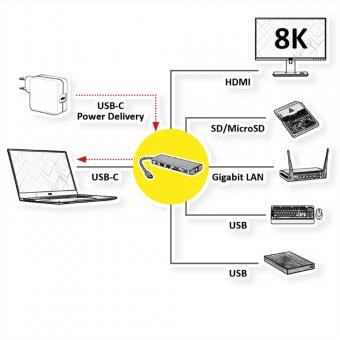 Station d'accueil USB type C, HDMI 8K30, 2x USB3.2 Gen1 (A), 1x PD, 1x LAN, SD/MicroSD