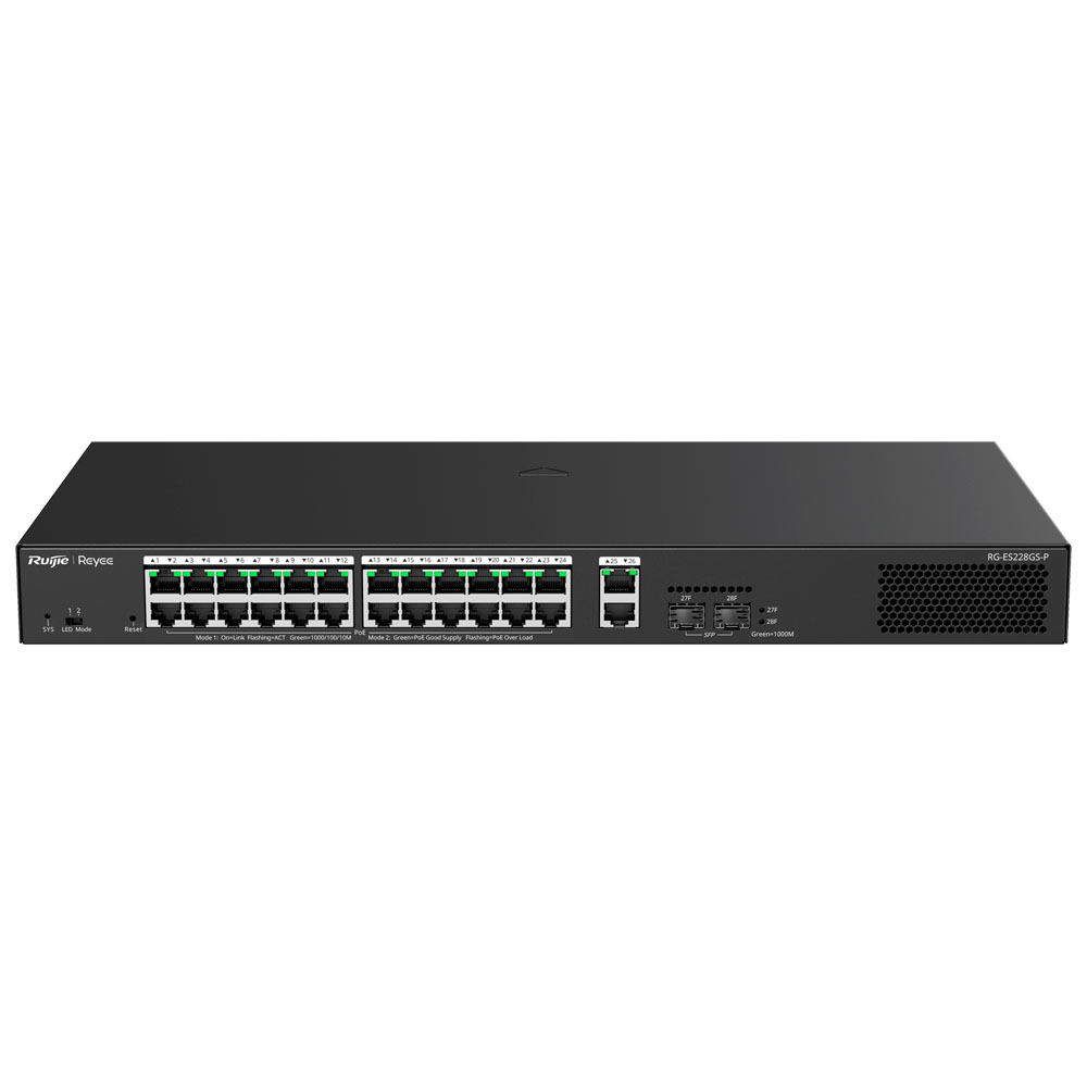 26 RJ45 10/100/1000Mbit/s + 2 SFP 10/100/1000, 30W pro Port 802.3af/at / maximal 370W, VLAN/Port-Isolation/Loop-Erkennung, Port-Geschwindigkeitsbegrenzung